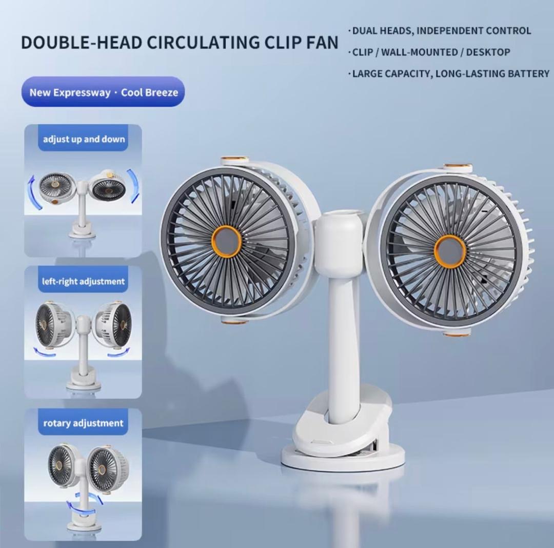 Rechargeable Dual-Head Fan ❄️🔋 (Clip, Hang, Stand & Suspend Design)